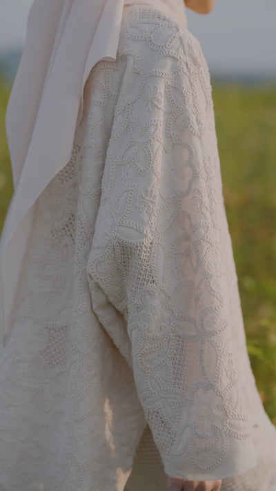 Designed with comfort and elegance in mind, the Bayu Kurung features a batwing-cutting silhouette with a refined construction and ornate, embroidered floral swirls, adding rich texture and visual depth.