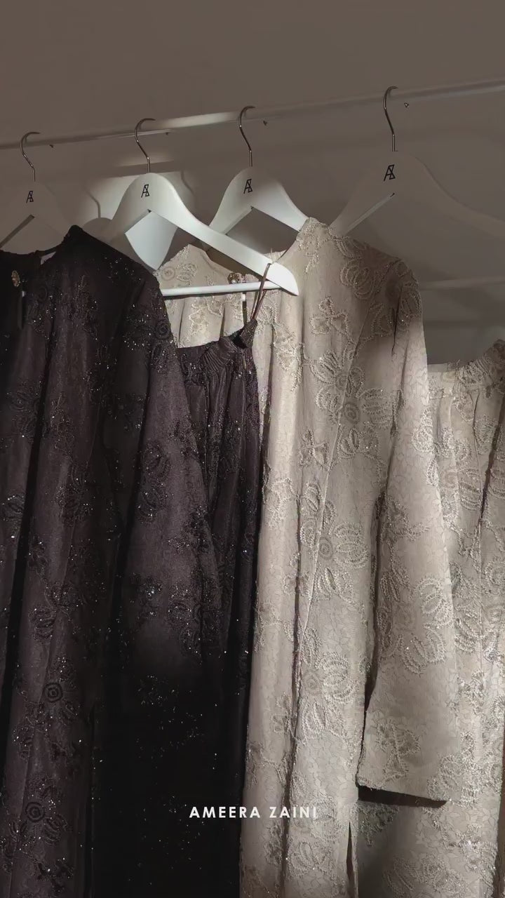 Dian Kurung embodies timeless elegance, where the iconic Malaysian silhouette meets the artistry of kain lipat batik detailing. Crafted with meticulous care from embroidered lace imbued with a subtle gold sheen, the design glimmers with delicate hints of refined gold, catching the light in quiet sophistication.