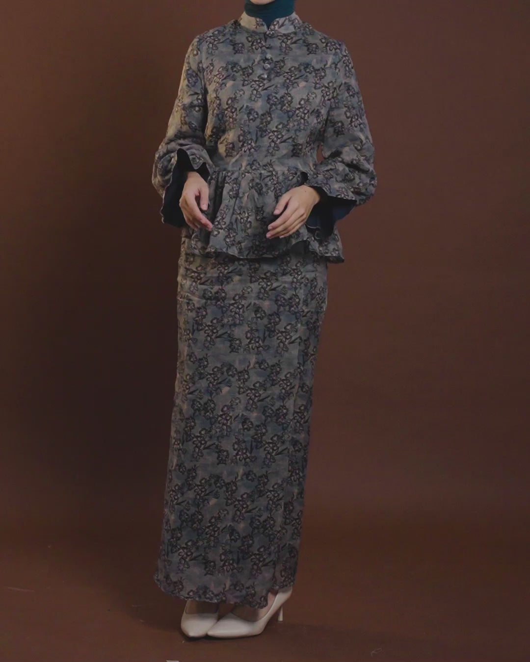 Where tradition meets modern grace, the Iris Peplum Kurung whispers elegance in every fold. A fitted bodice flows effortlessly into a softly flared peplum, paired with a batik-pleated skirt that sways with gentle sophistication, creating a silhouette that is at once feminine, structured and modestly refined.