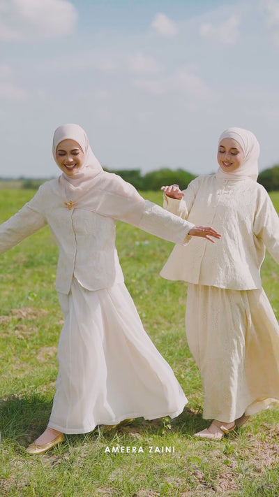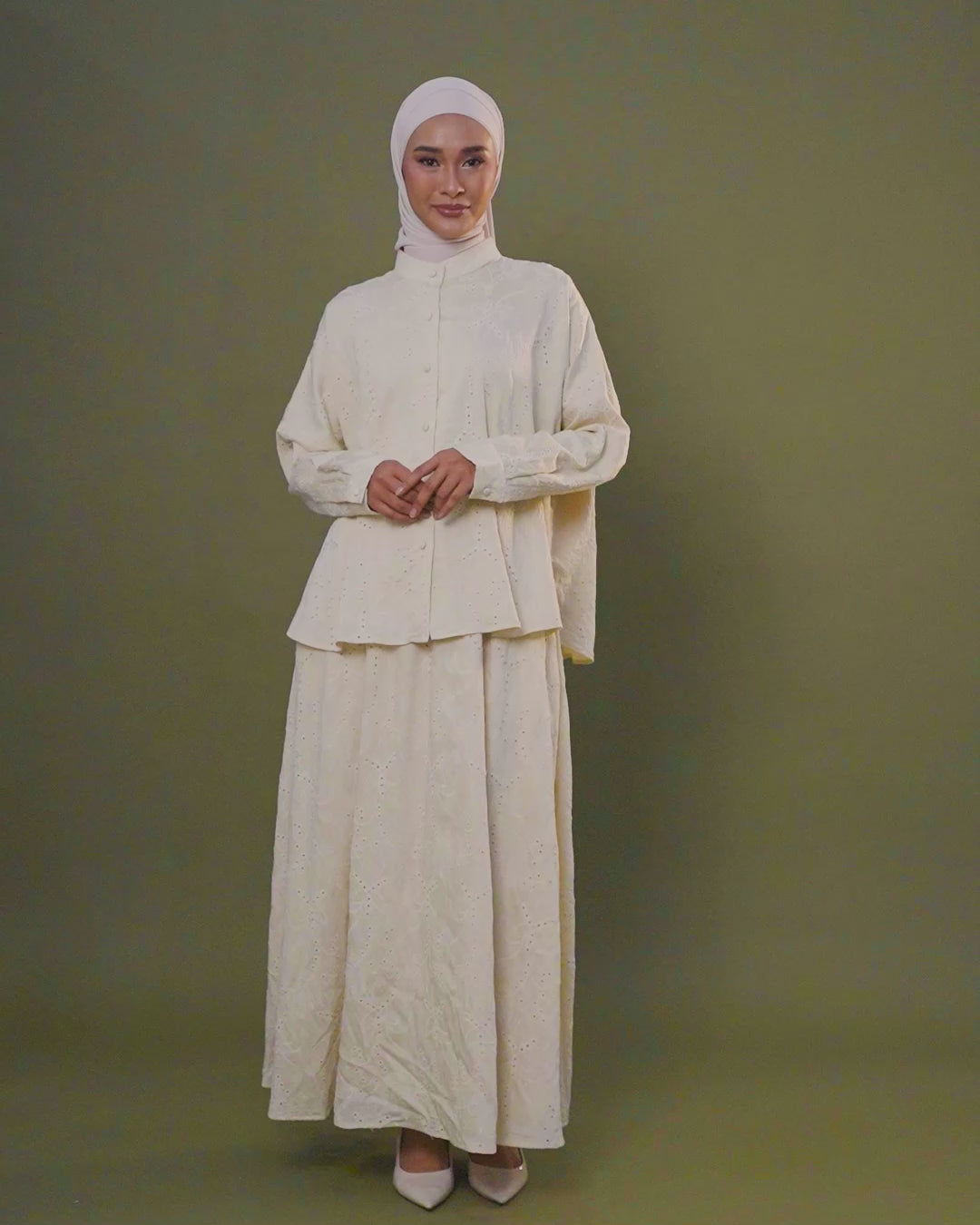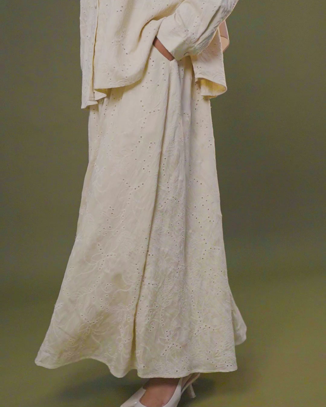 Timeless and refined, the Serene Luxe Set is crafted from lightweight fabric embellished with tonal all-over floral embroidery, creating a subtle yet luxurious texture that exudes understated elegance.